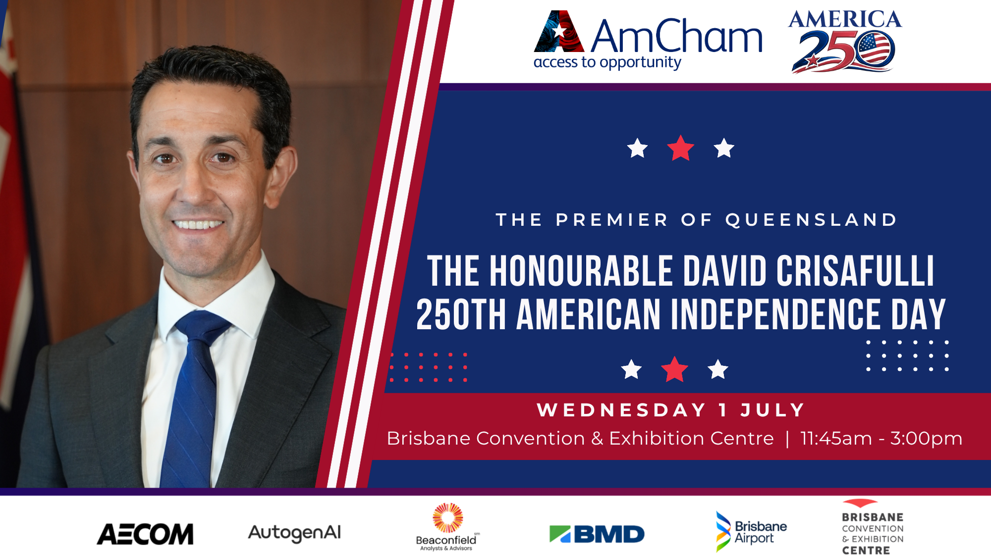 In 2025, Premier Crisafulli announced a push to bring the Quad meeting to Queensland and called for the resurrection of a US Consulate in Brisbane. Hear Premier Crisafulli’s thoughts on Queensland’s priorities and plans in 2026 as we navigate a fast-moving geopolitical climate. Not only will The Premier deliver a keynote address but he will also join a separate ‘in-conversation’ Q&A session with AmCham CEO, April Palmerlee.